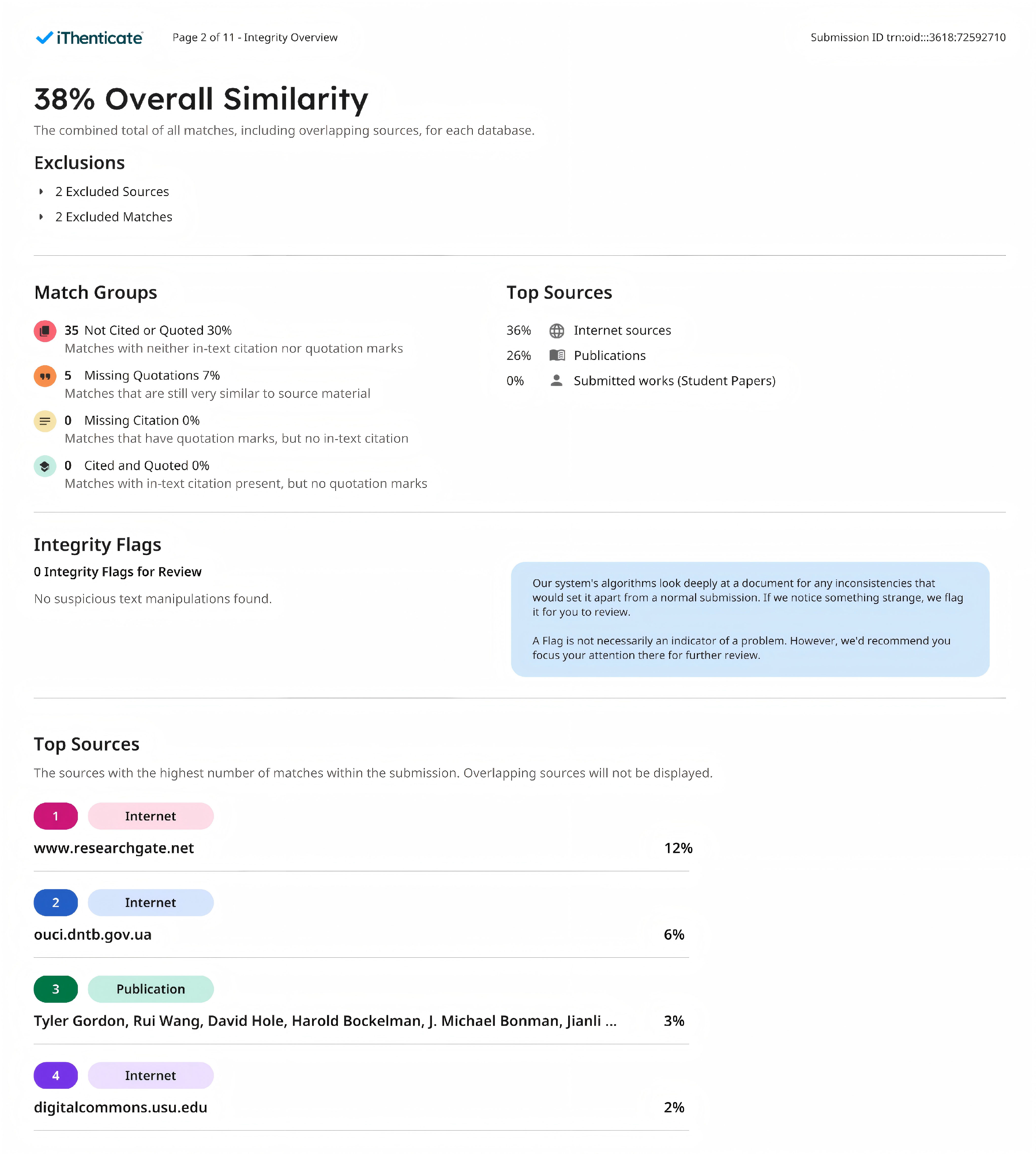 投必得使用国际期刊通用的查重软件为您的稿件进行查重,将您提交的完整文稿与海量全球数据库和网页内容进行比对,得出整体相似度指数,并在查重报告中展示高重复率的文本内容,清晰标注相似的段落或语句,同时自动追踪相匹配的重复来源。